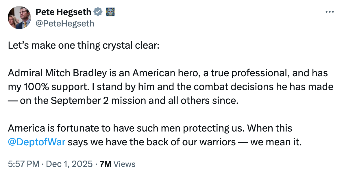 Hegseth and the White House have quickly and predictably shifted the blame, focusing on the actions of Admiral Frank Bradley, head of Special Operations Command. Always a sniveling coward, Hegseth posted backhanded praise of Bradley to make it clear where the responsibility lay.
